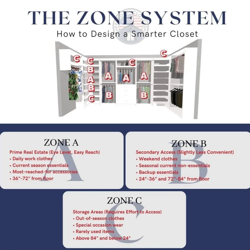 A great closet separates daily use, occasional use, and long-term storage. When everything gets mixed, organization collapses within months.